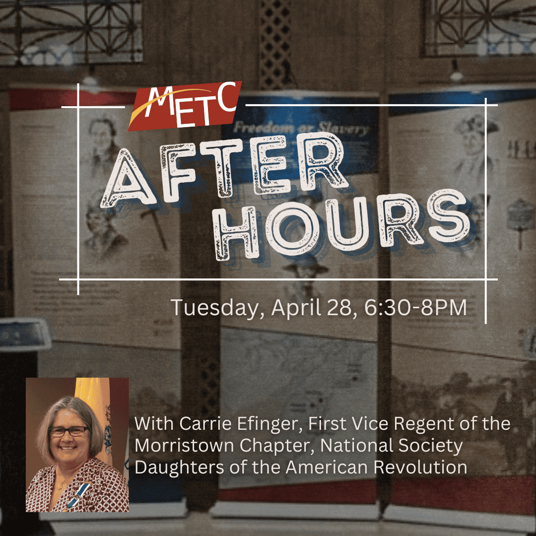 Join us at our After Hours with Daughters of the American Revolution to hear Carrie Efinger, First Vice Regent of the Morristown Chapter. Learn all about the founding of the DAR, the local Morristown chapter, and its ties to the American Revolution. Doors open at 6:30PM to view “The American Experience” exhibit and lecture begins at 7PM.