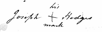 “State of New Jersey, Morris County so: Be it known that on the tenth day of April in the year of our Lord eighteen hundred & eighteen before me Gabriel H. Ford, Esq., one of the Judges of the Court of Common Pleas for the County of Morris in the State of New Jersey and resident of said County, personally appeared Joseph Hedges, of the township of Hanover in said County, who hath lost the power of speech, but is of sound mind and memory, who being duly sworn doth depose, declare & signify – That he this Deponent served as a private soldier in the war of revolution on the continental establishment against the common enemy for the term of two years and more – that he enlisted at Morristown in the County of Morris in the spring of the year seventeen hundred and seventy seven in Capt. Jonas Ward’s company in Col. Oliver Spencer’s regiment which was one of the additional sixteen regiments and served as a private soldier in said company during the time aforesaid – That while the army cantoned at Valley Forge in the winter of seventeen hundred and seventy seven-eight, he was sick there, and lay under the care of Jabez Campfield, Surgeon of said regiment by which sickness he this Deponent lost the power of speech and never since recovered it – that from the hospital he returned to the regiment and remained attached to it, drawing provisions and serving sometimes as a waiter, sometimes taking care of horses, and performing such services as his impaired health and want of speech allowed, until the end of the war, but was sick in the hospital when the army was disbanded, so that he does not remember to have obtained a discharge – that he this Deponent can neither read or write – that he is a resident citizen of the United States, so reduced in circumstances as to have received from charity, and is in need of assistance from his country for support, and that no pension has ever been allowed him by the United States, and further signifieth not –